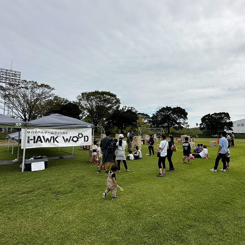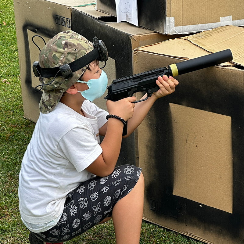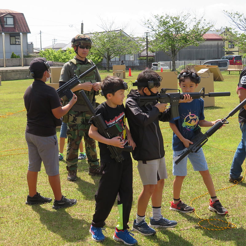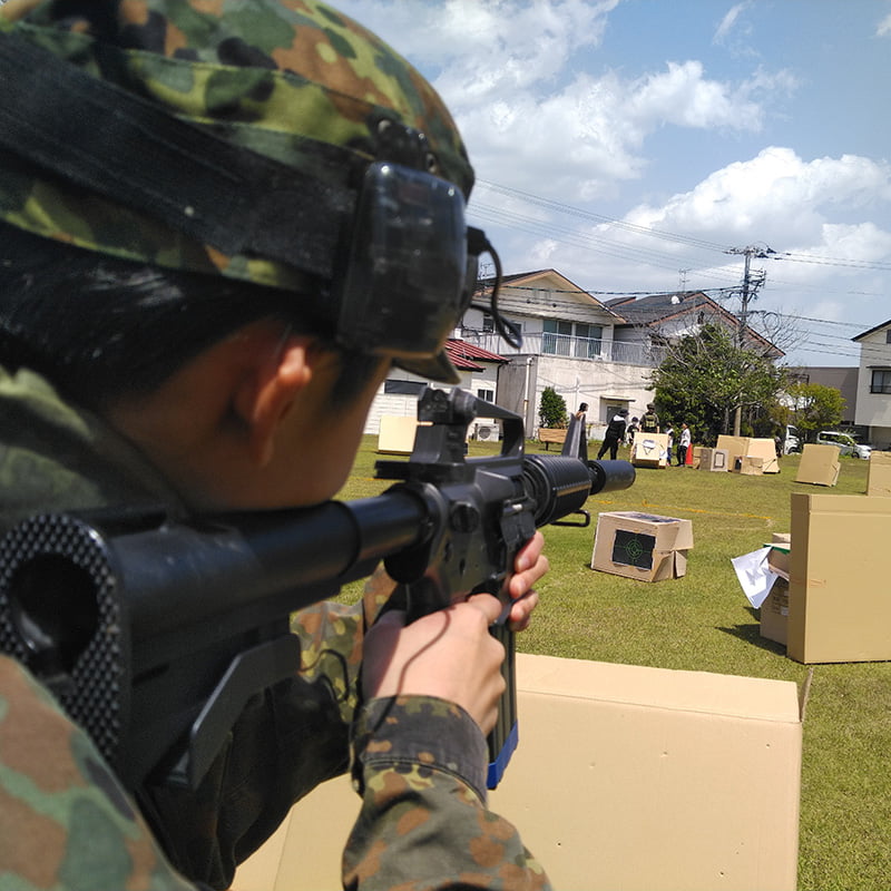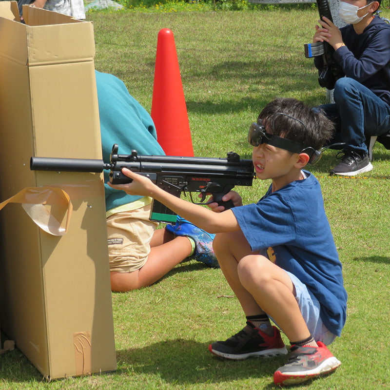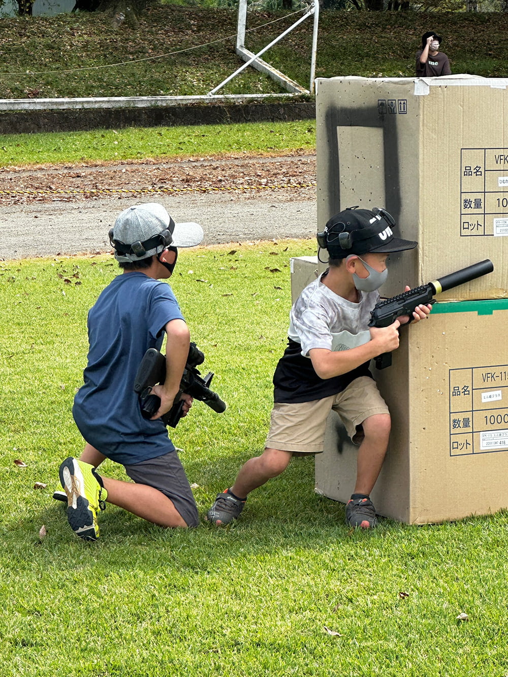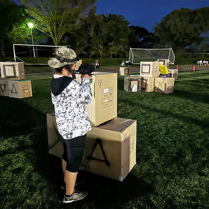 1時間の間にスタート地点を変更しながら、3〜4回実施します。(1ゲーム 約10〜15分)障害物に隠れながらレーザー発射機で狙って、相手チームのプレイヤーを出来るだけたくさん倒したチームの勝利になります。