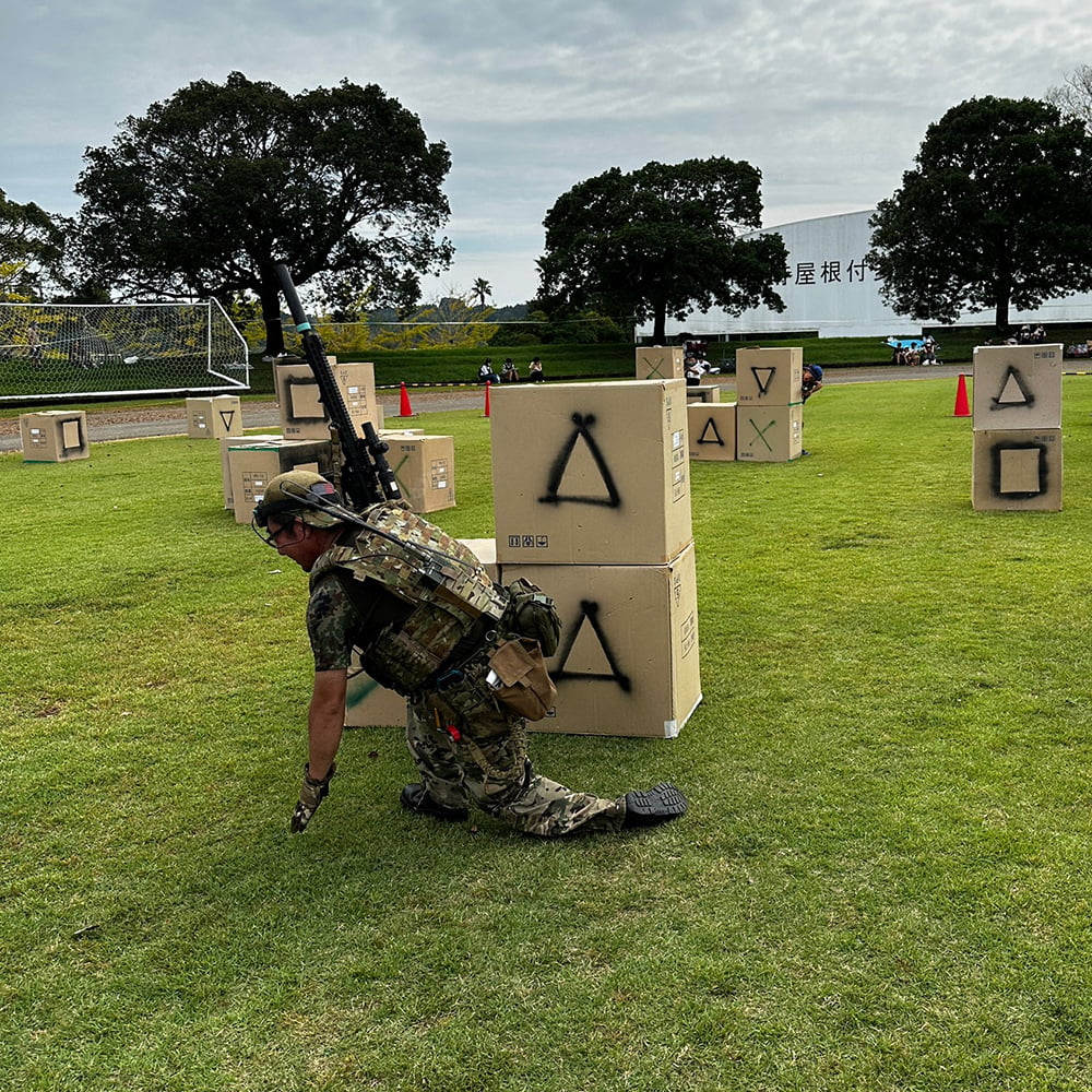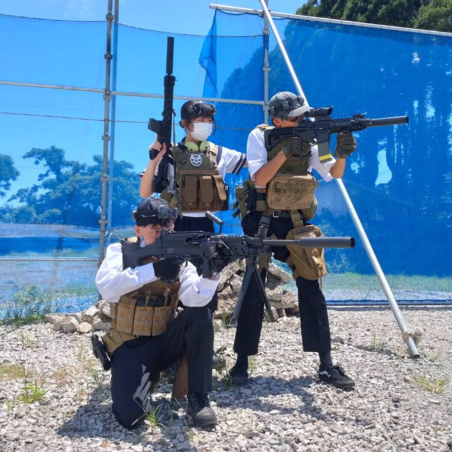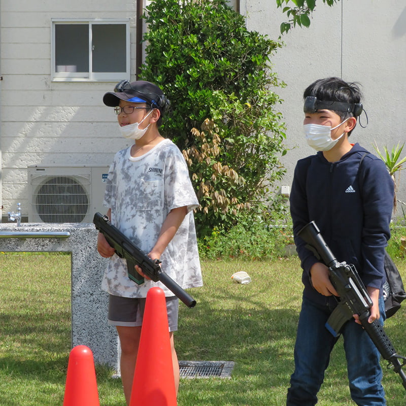 1時間の間にスタート地点を変更しながら、3〜4回実施します。(1ゲーム 約10〜15分)障害物に隠れながらレーザー発射機で狙って、相手チームのプレイヤーを出来るだけたくさん倒したチームの勝利になります。